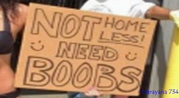 Dengan membawa papan bertulisan “bukan tunawisma, butuh payudara,” perempuan yang bernama Chrissy berdiri di pinggiran jalanan di Akron, Ohio. Chrissy berniat untuk terus mengemis hingga mendapatkan uang yang cukup.
