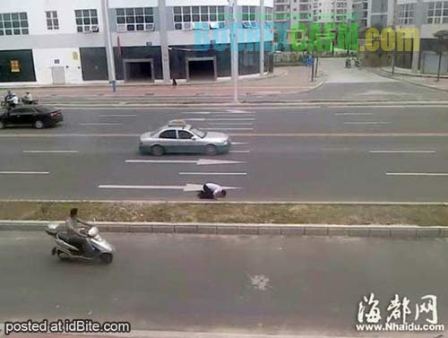 Setiap beberapa langkah, pria ini bersujud di atas aspal jalan raya kota Putian, Provinsi Fujian. Dahinya terlihat merah karena lumuran darah. Para pejalan kaki berhenti untuk melihat kejadian tersebut.