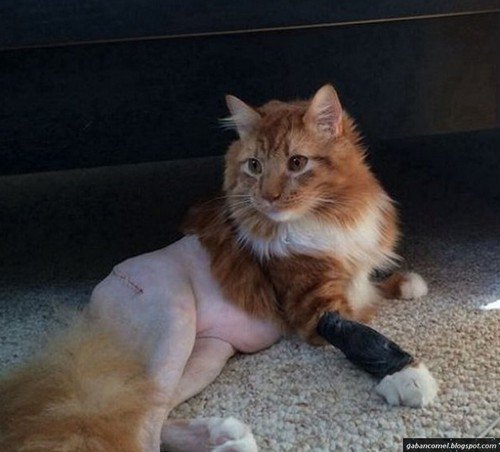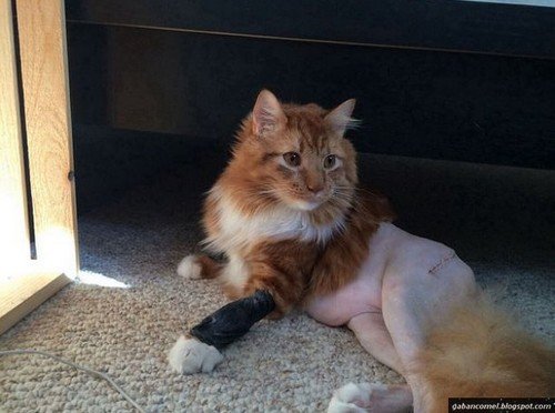 Akibatnya, tubuh bahagian bawah yang hanya meninggalkan kulit kelihatan seperti ayam yang bulunya sudah dicukur. Kucing tersebut baru saja menjalani pembedahan yang memerlukan bulunya dicukur.
