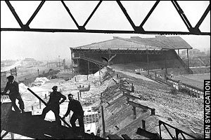 Selama masa perang, tentara Jerman menyerang Inggris habis-habisan. Stadion Old Trafford juga tidak luput dari sasaran bom pada tanggal 11 Maret 1941. Tribun-tribun stadion hancur dalam reruntuhan, rata dengan lapangan yang hangus terbakar. Gara-gara serangan ini, Old Trafford tidak bisa lagi digunakan.