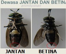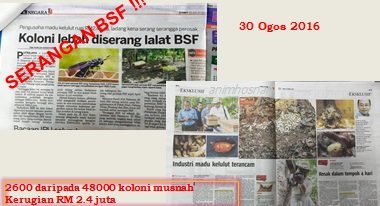 BLACK SOLDIER FLY BLACK SOLDIER FLY (Hermetia illucens) merupakan sejenis serangga daripada keluarga Stratiomyidae bersaiz kecil berwarna hitam yang menjadi perosak merbahaya kepada industri ternakan lebah dan juga kelulut di negara kita. Penulis merujuk kepada Bahagian Biosekuriti Tumbuhan, Jabatan Pertanian, Kuala Lumpur dimana rekod menunjukkan lalat BSF ini telah menyerang sebanyak 2,600 koloni kelulut sehingga 31 Ogos 2016. Ia merupakan serangan 5.5% daripada keseluruhan koloni kelulut di Malaysia iaitu sebanyak 48,000 koloni diseluruh negara. Kerugian akibat serangan BSF ini telah dianggarkan sebanyak RM2.4 juta (Sumber: Jabatan Pertanian Malaysia). Serangga yang juga dipanggil sebagai ‘Lalat soldadu hitam’ ialah sejenis lalat yang biasa dimana larvanya akan hidup dengan menghuraikan kompos terutama pada tahi ayam. Sehubungan dengan itu dilaporkan bahawa larva serangga ini banyak digunakan dalam proses menyediakan dan aktiviti pengurusan baja organik. Larva dan pupae serangga ini yang terhasil dari penguraian baja organik ini boleh juga digunakan sebagai makanan ikan hiasan atau makanan ternakan lain. Telor lalat BSF ini akan mengambil masa hanya 4 hari untuk menetas dan biasanya terdapat pada celah kayu atau berhampiran dengan bahan yang sedang mereput. Kerosakkan oleh serangga ini biasanya akan berlaku terhadap industri lebah dan kelulut apabila serangga dewasa bertelur dalam koloni lebah atau kelulut dimana telur yang menetas menjadi larva mengambil madu, roti lebah dan keseluruhan broodcell dalam proses pembesarannya. Akibatnya adalah dimana keseluruhan koloni akan terhapus dalam beberapa hari sahaja selepas dijangkiti oleh larva ini. Bagaimana pun penulis melihat selalunya tidak ada berlaku kerosakkan akan berlaku pada struktur propolis kerana ia ada kandungan lilin yang tinggi. Kes serangan serangga ini kurang dilaporkan oleh penternak pada waktu dahulu dahulu tetapi kini sudah kerap kedengaran apabila peserta projek kelulut mula terganggu. Artikel subuh ini saya berusaha untuk menulis dalam “Anim Agro Technology” mengenai sejenis serangga perosak dinamakan Black Soldier Fly (BSF) atau mudahnya dipanggil Lalat Soldadu Hitam dan beberapa kaedah atau cara kawalan jika berlaku serangan sebagai bahan bacaan dan rujukkan anda.