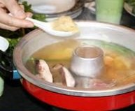 Cara masakan stimboat yang berasal dari Mongolia dan China ini dipelopori oleh orang-orang nomad Mongolia dimana mereka masak daging dan sayur di dalam periuk yang diletakkan di atas unggun api (Sila lihat foto disebelah). Teknik menghiris daging dibuat dengan nipis supaya dapat memasak tanpa menggunakan bahan api yang banyak. Mereka menggunakan daging lembu dan daging kambing serta menambah makanan laut sebagai tambahan. Kalau dahulu mereka masak menggunakan bahan bakar batu arang secara tradisional tetapi kini ia digantikan dengan bahan periuk elektrik atau gas. Cara untuk memasak stimboat banyak berubah mengikut lokasi dan kreativiti dimana bahan-bahan makanan yang telah digunakan amat berbeza. Campuran bahan yang digunakan dan sos khas menentukan keenakan dan keunikan stimbot. Dalam menyediakan masakan stimbot dirumah, saya sering menggunakan bahan stimbot terdiri daripada daging ayam, daging lembu, fish cake, bebola ikan, bebola ketam, tauhu, pelbagai jenis sayuran hijau, kobis, udang, sotong dan sebagainya. Lazimnya daging ayam atau lembu di hiris dengan amat nipis. Menghiris daging sejuk beku dengan cara ini akan menyebabkannya menggulung dan sering dihidangkan dengan bentuk sebegini. Periuk masak eletrik sering diletakkan diatas meja dan dipanaskan dengan gas propana atau eletrik. Air yang dimasukkan kedalam periuk khas dicampur dengan garam, serbuk sup atau tomyam serta ramuan lain yang sesuai seperti halia. Daging dan sayur dimasukkan ke dalam periuk secara berasingan dengan penyepit dimana masa masaknya adalah singkat sahaja. Daging seringnya hanya memerlukan masa 15 hingga 30 saat untuk masak. Semua bahan tersebut dimasukkan kedalam mangkuk kecil sebelum dicelup dengan sos khas untuk dimakan sewaktu suam panas.