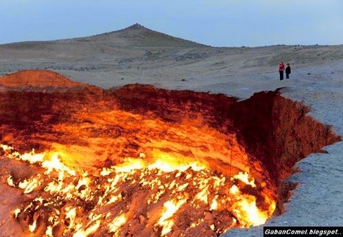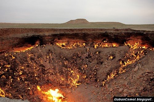Terletak kira-kira 270 kilometer sebelah utara Ibukota Ashgabat berhampiran Perkampungan Derweze, “Pintu menuju neraka” ini disebut sebagai bekas peninggalan dari hasil dari kajian yang pernah dilakukan oleh para saintis Soviet. Pejabat Pelancongan Turkmenistan berharap ini akan sebuah objek pelancongan baru di Turkmenistan dan membantu meningkatkan jumlah pengunjung pelancongan yang ketika ini hanya 12,000 hingga 15,000 orang daripada kira-kira 50 negara setiap tahun.