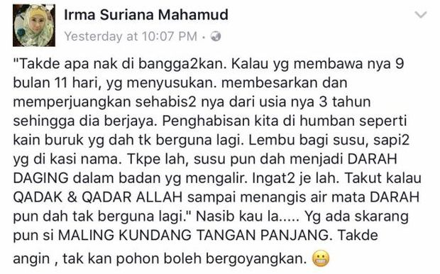 Irma Suriana meluahkan rasa itu kerana berasa kecil hati dan kecewa dengan darah daging sendiri. Tidak dijelaskan secara terperinci apakah perkara sebenar yang terjadi antara dua beranak itu.