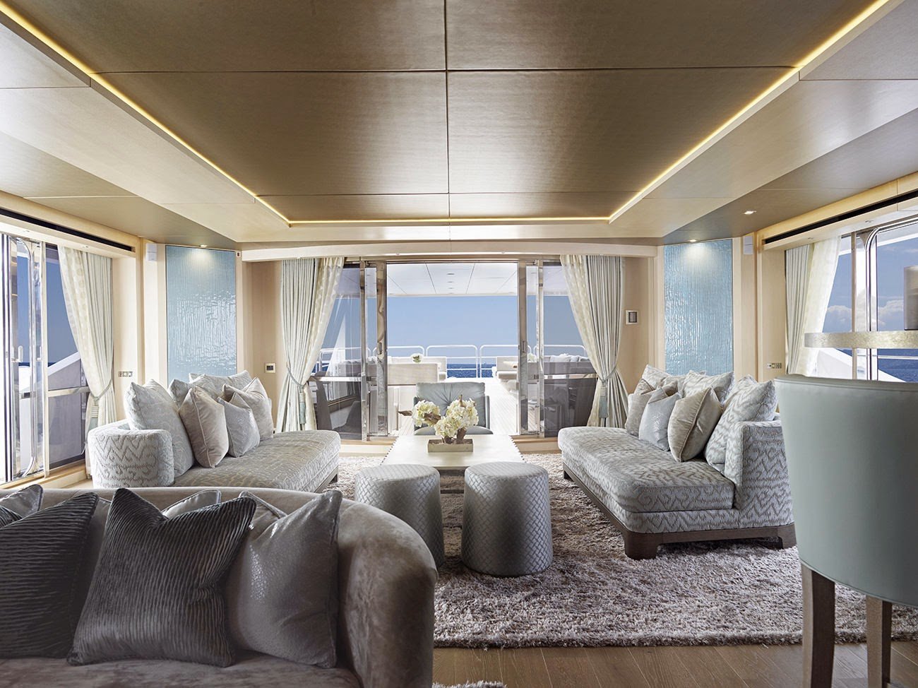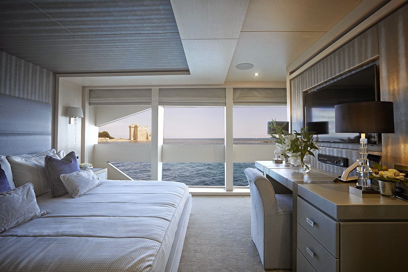 The two VIP cabins on the main deck feature ceiling to floor windows creating a dramatic feeling of light and space, as well as spectacular views.