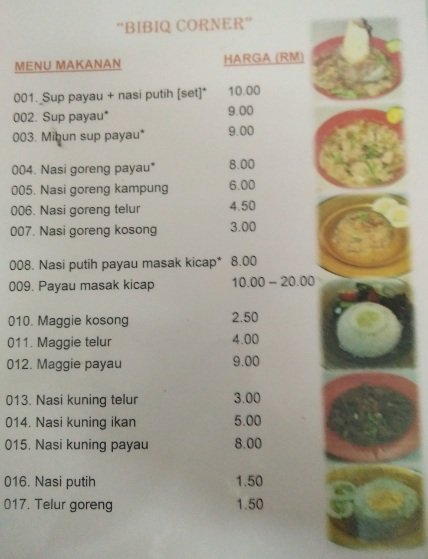 Penulis blog juga meninjau harga sup payau dari senarai yang dipaparkan (Sila lihat foto disebelah). Senarai paling atas adalah harga set sup payau dengan nasi putih berharga RM10.00/set. Harga untuk semangkok sup payau ddipaparkan dengan harga RM9.00. Sementara itu hidangan mee hoon sup payau dijual pada harga RM9.00 semangkok dan harga nasi goreng payau adalah RM8.00 sepinggan. Kepada mereka yang ingin makan nasi goreng kampong juga boleh mendapatkannya pada harga RM6.00. Dalam mesnu yang diletakkan diatas meja dinyatakan harga nasi goreng kosong adalah RM3.00 dan harga nasi goreng telur adalah RM4.50. Antara hidangan istimewa disini adalah nasi putih dengan daging payau masak kicap adalah RM8.00 sementara hidangan khusus daging payau masak kicap sekitar RM10.00 – RM20.00 bergantung kepada saiz order. Pelik juga direstoten ini ada dijual Mee Maggie daging payau dijual dengan harga RM9.00 satu mangkuk. Mee maggi kosong dijual dengan harga RM2.50 dan mee maggie telur dijual pada harga RM4.50. Hidangan lain adalah nasi kuning telur dijual dengan harga RM3.00, nasi kuning ikan dengan harga RM5.00 dan nasi goreng payau dengan harga RM8.00 satu pinggan. Jika ingin lauk tambahan telur goreng dijual pada harga RM1.50 dan nasi putih juga RM1.50 sahaja.