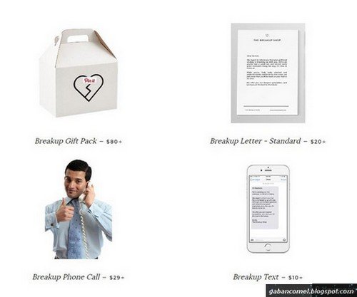 Mulai dari sekadar e-mel atau mesej teks untuk mengatakan putus hingga pakej lengkap. Harganya pun berbeza-beza. Untuk e-mel atau mesej teks harganya ialah 10 USD , sebuah surat 20 USD , sebuah telefon 29 USD dan pakej lengkap mulai dari 80 USD (.