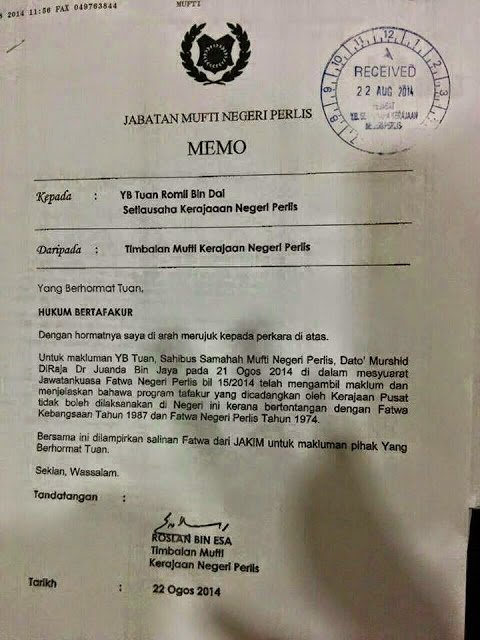 SEBUAH memo dikeluarkan oleh Jabatan Mufti Negeri Perlis bertarikh 22 Ogos 2014, hari ini tersebar di laman² sosial facebook dan twitter.