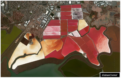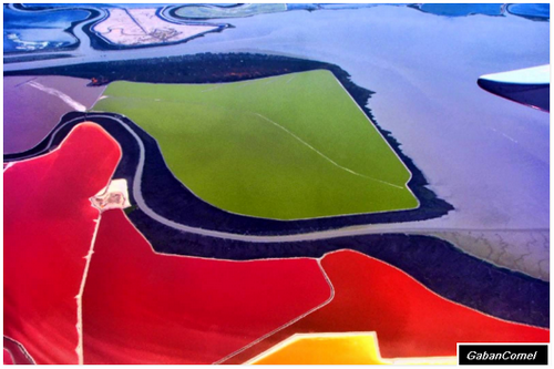 Kolam-kolam garam ini berkisar dari warna hijau, biru hingga magenta adalah berwarna semula jadi disebabkan oleh mikroorganisma yang berkembang maju seiring peningkatan tahap kemasinan. Warna menunjukkan kemasinan kolam dan jenis pembiakan mikroorganisma di atasnya.
