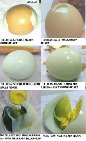 Dalam pada itu dinyatakan dimana terdapat perbezaan telur ayam asli (kanan) dan tiruan selepas direbus. Kepada anda yang ingin mengenal telur tiruan selepas direbus boleh melakukannya dengan memecahkan telur tersebut dimana  putih telur dan kuning telur akan segera bercampur (Sila lihat foto paling bawah). Kedua dilihat cangkerang telur tiruan agak berkilat berbanding telur sebenar akan tetapi tidak begitu ketara. Ke 3 adalah apabila disentuh dengan tangan, ia terasa agak kasar berbanding telur sebenar. Ke 4 dimana apabila telur tiruan digoncang ia akan berbunyi kerana air berlebihan daripada bahan pepejal. Ke 5 dimana telur sebenar agak berbau seperti daging mentah. Ke 6 apabila anda mengetuk-ketuk sedikit telur itu didapati telur sebenar berbunyi lebih rapuh berbanding telur tiruan. Ke 7 adalah dengan mememecahkan telur tiruan dan akan kelihatan dimana kuning telur dan putih telur akan cair bersama. Ini disebabkan kuning telur dan putih telur dihasilkan daripada bahan mentah yang sama. Ke 8 dimana kKetika menggoreng telur tiruan, kuning telur akan mengembang tanpa disentuh. Umum tahu dimana telur adalah sumber protein yang murah dan dimakan oleh penduduk Malaysia. Memandangkan ia merupakan makanan kegemaran ramai maka Persatuan Pengguna Pulau Pinang menggesa pihak berkuasa supaya menjalankan siasatan dengan segera berhubung isu telur tiruan ini. Tambahan pula, telur tiruan mungkin mengandungi gelatin yang haram dimakan oleh orang Islam.