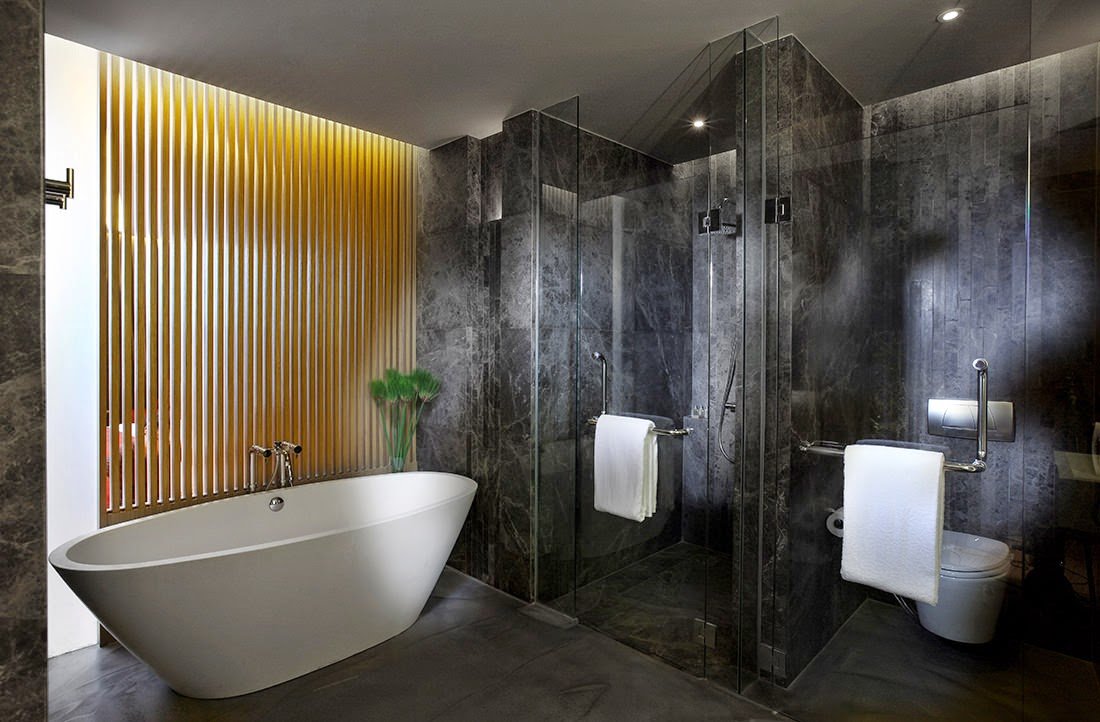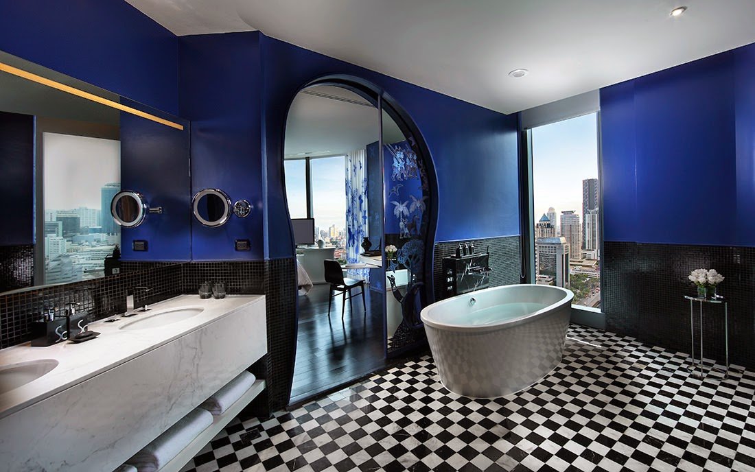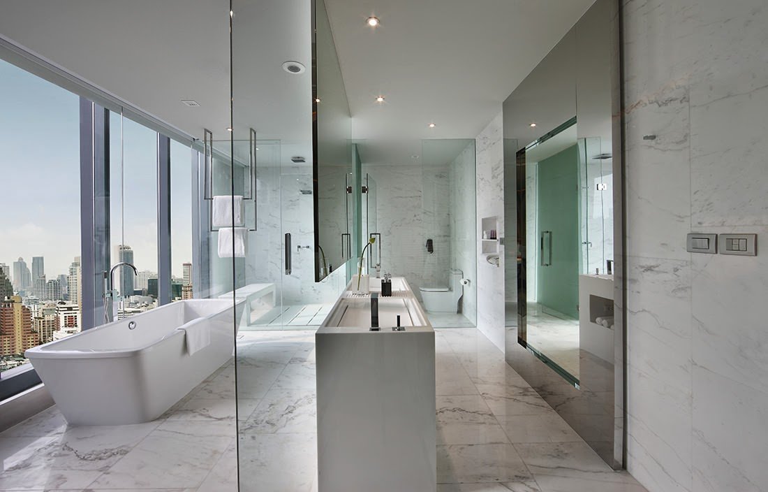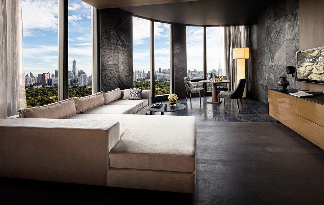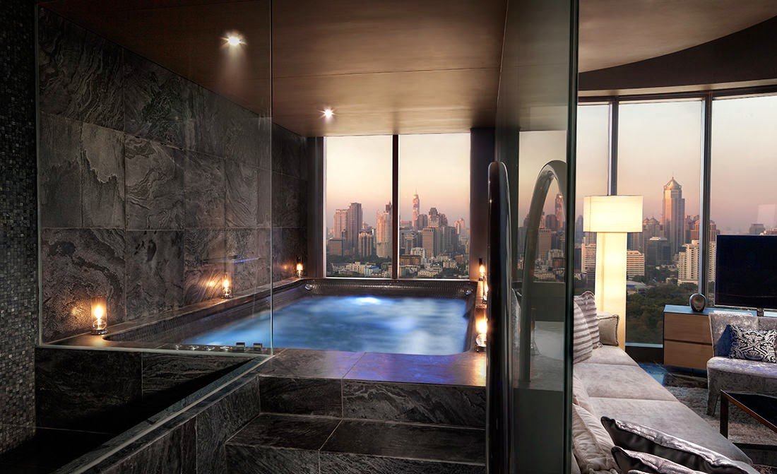 Created by Pongthep Sagulku of August Design, the Water element rooms feature an onyx bathtub next to the window and marble walls with a dark and mysterious tone that dims and stills the room to absorb the striking view of Bangkok from floor-to-ceiling windows.