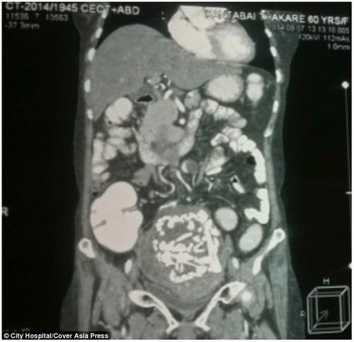 Namun, setelah dilakukan CT scan, kelihatan gumpalan material yang sudah mereput di antara rahim, usus, dan pundi kencing. Berdasarkan hasil pemeriksaan, terungkap ketulan itu adalah tulang bayi yang sudah berada di perut Jyoti selama 36 tahun.