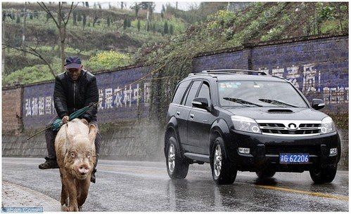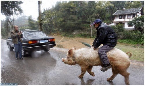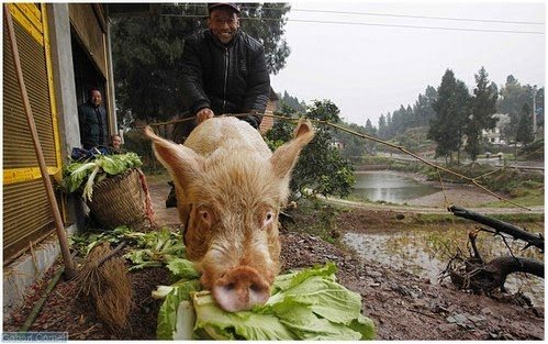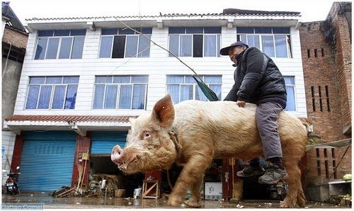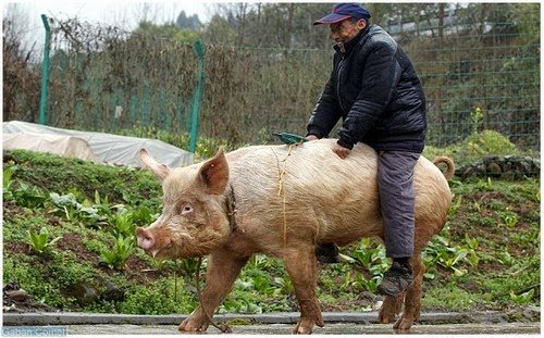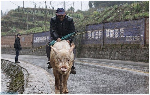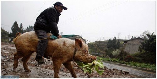 Seorang petani tua di China menunggang babi ketika pergi bersiar-siar atau ke bandar. Cara ini ditempuh sebab kakinya sakit ketika melangkah dan dia sudah melakukan ini selama tiga dekad.