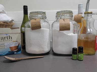 There is a giant container of bicarb soda that is used for cleaning the toilet and oven plus used for toothpaste. And I have vinegar which is a great multipurpose cleaning tool for the windows and a multitude of stuff.