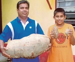 Cerita mengenai Ubi Kayu Gergasi juga menarik untuk dikongsi dengan penulis blog. Laporan daripada Balik Pulau, Pulau Pinang ini dikongsi bersama oleh seorang pesara TLDM iaitu Encik Johar MAnsor berumur 53 tahun dimana dia mengambil masa 30 minit untuk menggali ubi kayu ini. Beliau dan anaknya mulakan kerja mengorek tanah dilakukan dengan berhati-hati dan teliti dengan menggunakan parang bagi mengelak isi ubi rosak. Beliau amat teruja apabila berjaya untuk mengeluarkan ubi kayu gergasi di kebunnya (Sila lihat foto disebelah). Dakwa beliau di pergi kekebunnya di Kampung Bukit Kecil, Sungai Pinang asalnya hanya untuk membersih dan memeriksa tanamannya. Setelah beberapa ketika memantau tanamnnya beliau kemudian tertarik dengan saiz batang pokok ubi kayu sebesar genggaman orang dewasa dan dianggap luar biasa dan berbeza dengan pokok lain. Berikutan itu dia mengambil keputusan untuk menggali ubi berkenaan bagi melihat akan hasilnya dan berasa teruja selepas menemui ibu kayu gergasi dianggarkan seberat 20.20 kilogram itu. Walau pun pada mulanya dia hanya menggunakan cangkul, namun pelik kerana belum dapat melihat isinya. Dia awalnya mula risau jika dia akan merosakkan ubi lalu saya mengorek tanah menggunakan parang. Selepas hampir satu meter mengorek tanah kemudian dia mula melihat isi ubi berkenaan dan bagi mengelakkan ia rosak dia terpaksa mengorek tanah di sekelilingnya dengan berhati-hati. Sebenarnya usaha beliau mengeluarkan ubi kayu gergasi berdepan kesukaran kerana kedudukannya tertanam jauh di dalam tanah. Katanya dia terpaksa menggunakan kekuatan yang ada bagi menarik keluar isi ubi berkenaan. Dia tidak bercadang memproses isi ubi itu kepada bahan makanan atau hidangan istimewa dan sebaliknya mahu menyimpan bagi memberi peluang pada masyarakat melihat sendiri keunikannya. Semuga artikel ini mampu memberi info berguna kepada pembaca anim agro technology semua. Wasallam!!!…