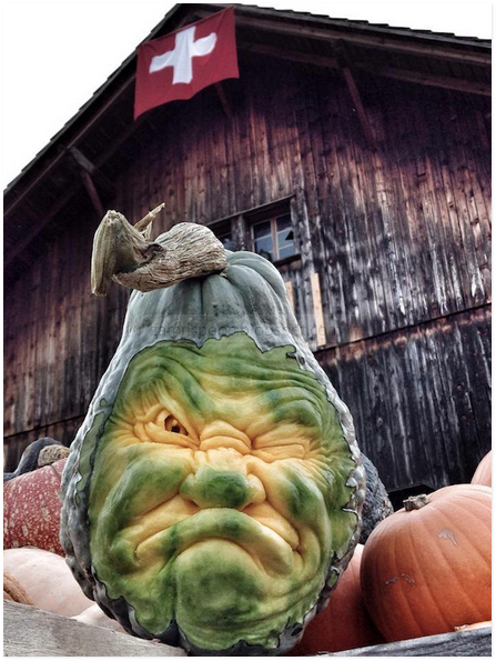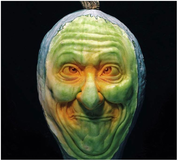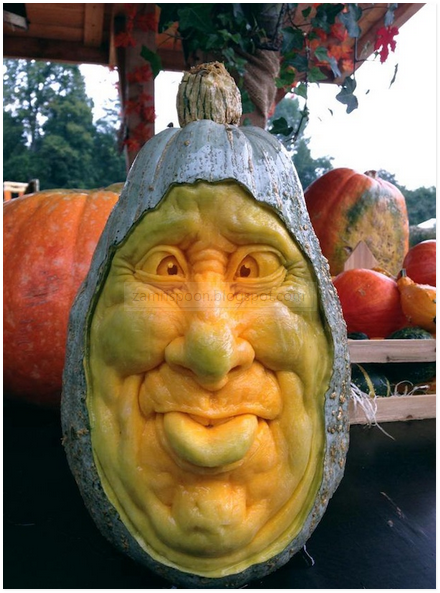 Kali ini, ia tidak mengukir pada labu tradisional, tapi pada labu Hubbard, sebuah labu musim sejuk, yang ada di sekitar Hubbard dengan warna hijau gelap.