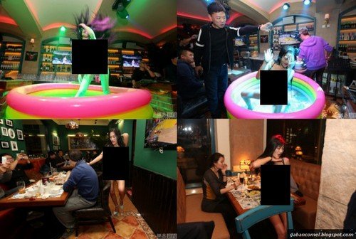 Terletak di Shenyang, China, sebuah bar menyediakan hiburan untuk para lelaki bujang dengan beberapa gadis seksi berbikini. Para gadis ini dengan senang hati berkeliling menemani para pengunjung bahkan melakukan tarikan di dalam kolam plastik mainan yang juga disediakan di dalam bar.