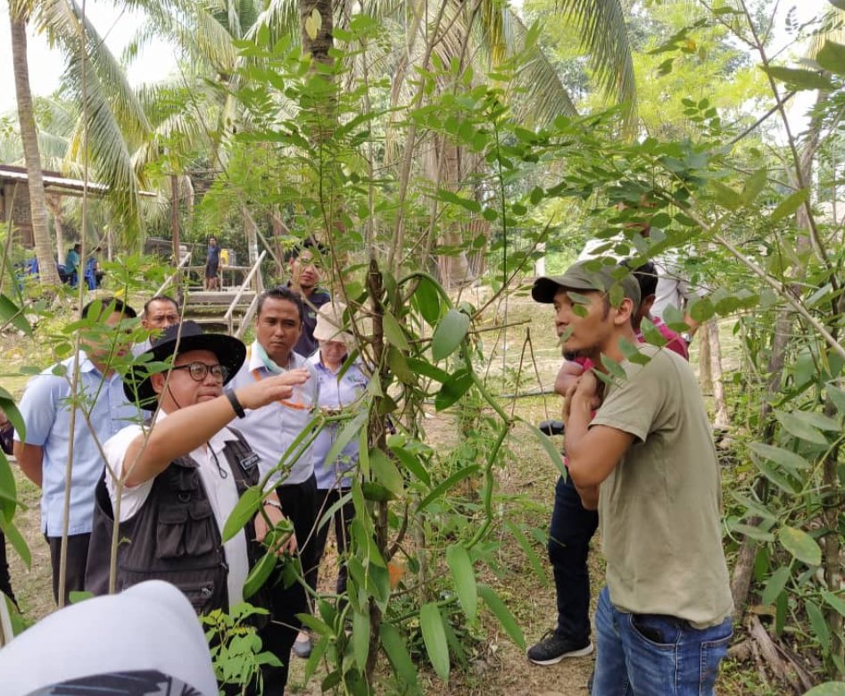 TANAMAN VANILLA (Vanilla fragrans) merupakan satu aktiviti pertanian yang agak kurang mendapat perhatian dikalangan petani di Malaysia. Penulis blog berkesempatan untuk membuat tinjauan teknologi di Kebun Vanilla di Kg Parit Bangau, Temerloh, Pahang iaitu Kebun milik Mohd Feizal Mohd Narawi berumur 35 tahun dinamakan ‘Amani Vanilla’. Petani muda ini gigih menanam vanila di Pahang dimana dahulu beliau adalah seorang wartawan sambilan yang pernah beberapa kali menulis berita pertanian berkaitan penulis blog semasa bertugas di Pahang. Beliau yang saya kenali semenjak beberapa tahun dahulu pernah menanam cili fertigasi dan beberapa tanaman lain disekitar Temerloh dimana kini menumpukan perhatian kepada penanaman vanilla. Tanaman vanilla beliau seluas 4 ekar berada dibawah naungan pokok kelapa Matag milik keluarganya yang mana bennihnya adalah diterima daripada Jabatan Pertanian Jorak yang kini sudah berumur 12 tahun. Kadar naungan pokok nangka sekitar 30-40% seperti yang diperlukan oleh tanaman vanilla. Tanaman Vanila adalah sejenis tumbuhan keluarga orkid yang berasal dari Mexico dan kini banyak ditanam di kawasan tropika. Dari sejarah dilaporkan dimana tanaman vanila ditemui oleh orang Sepanyol yang diketuai oleh Bernal Diaz del Castillo pada 1952. Saintis dapati ada sekitar 100 jenis spesies vanila tetapi hanya sedikit yang dikenal pasti mempunyai nilai komersil iaitu spesis Vanilla planifolia Andrews dan juga jenis Vanilla tahitensis JW Moore. Penanaman vanilla di Malaysia hanya ada dilaksanakan hanya dibeberapa lokasi seperti di Sabah, Pahang dan Kedah sahaja dan tiada dikomersilkan kerana ia memerlukan kemahiran tinggi dan juga bahan tanaman yang sesuai untuk petani lakukan amalan agronominya. Artikel pada petang ini dalam blog ”Anim Agro Technology” saya menulis lagi mengenai hasil tinjauan teknologi ke kebun vanilla milik Mohd Feizal di Temerloh untuk bahan rujukkan anda semua.