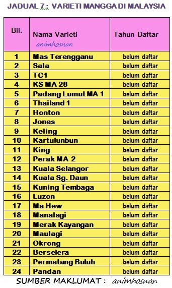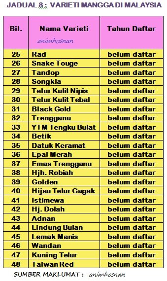 Jadual 8 pula sambungan varieti mangga yang belum berdaftar dari nombor 25 (Varieti Rad) sehingga Nombor 48 (Varieti Mangga Taiwan Red). Nama-nama varieti tersebut penulis blog dapati dan melihat macam jenis baru yang dibawa masuk daripada luar negara dan cuba ditanam di Malaysia. Didalam program pembiakbakaan mangga (Mango Plant Breeding) memang ada keperluan semua varieti mangga yang ada ini didaftarkan agar penyelidikan mendapatkan baka mangga baru yang lebih baik dapat dihasilkan. Sebaiknya semua varieti mangga yang telah dan belum didaftar ini ditanam didalam Bank Janaplasma (Germplasm) atau pun sebagai baka dimana akan datang. Mana tahu satu hari nanti varieti mangga yang disenaraikan akan menjadi popular dan dapat dikomersilkan. Semuga maklumat ini memberi info berguna kepada pembaca anim agro technology kali ini. Wallahualam!..