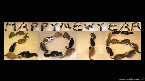 Dia memberi makan sepuluh kucingnya dengan menetapkan mangkuk secara hati-hati dan menggeser tubuh mereka ke sudut yang tepat, sehingga membentuk tulisan “Happy New Year 2016”.