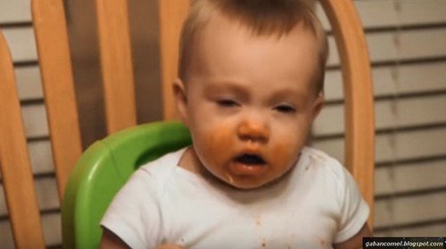 Bayi dalam video di bawah belajar bagaimana cara makan spageti. Semangatnya, bayi itu sampai comot mulutnya dan bersin mengeluarkan spageti dari hidungnya.