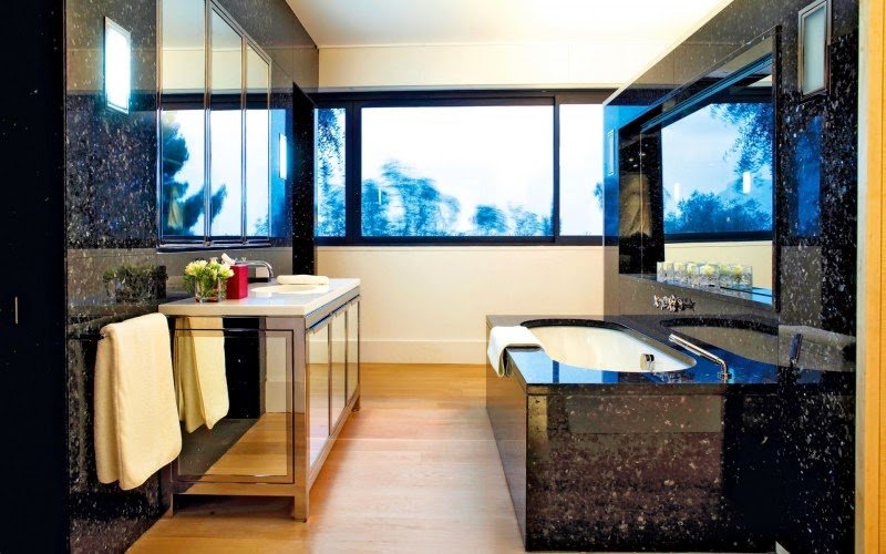 A bold statement in contemporary architecture, the expansive glass walls, glass lift and central atrium integrate the outside and inside to give a breath-taking feeling of light and space…and more space. Villa O has a colossal 1250 sq metres (13,455 sq feet) of living space that includes a large open-plan kitchen, breakfast bar and dining area, a huge galleried lounge with a library and second sitting room area, four en suite guest rooms and a staff guestroom. In addition there is also a guesthouse in the grounds with a further 2 guest rooms.